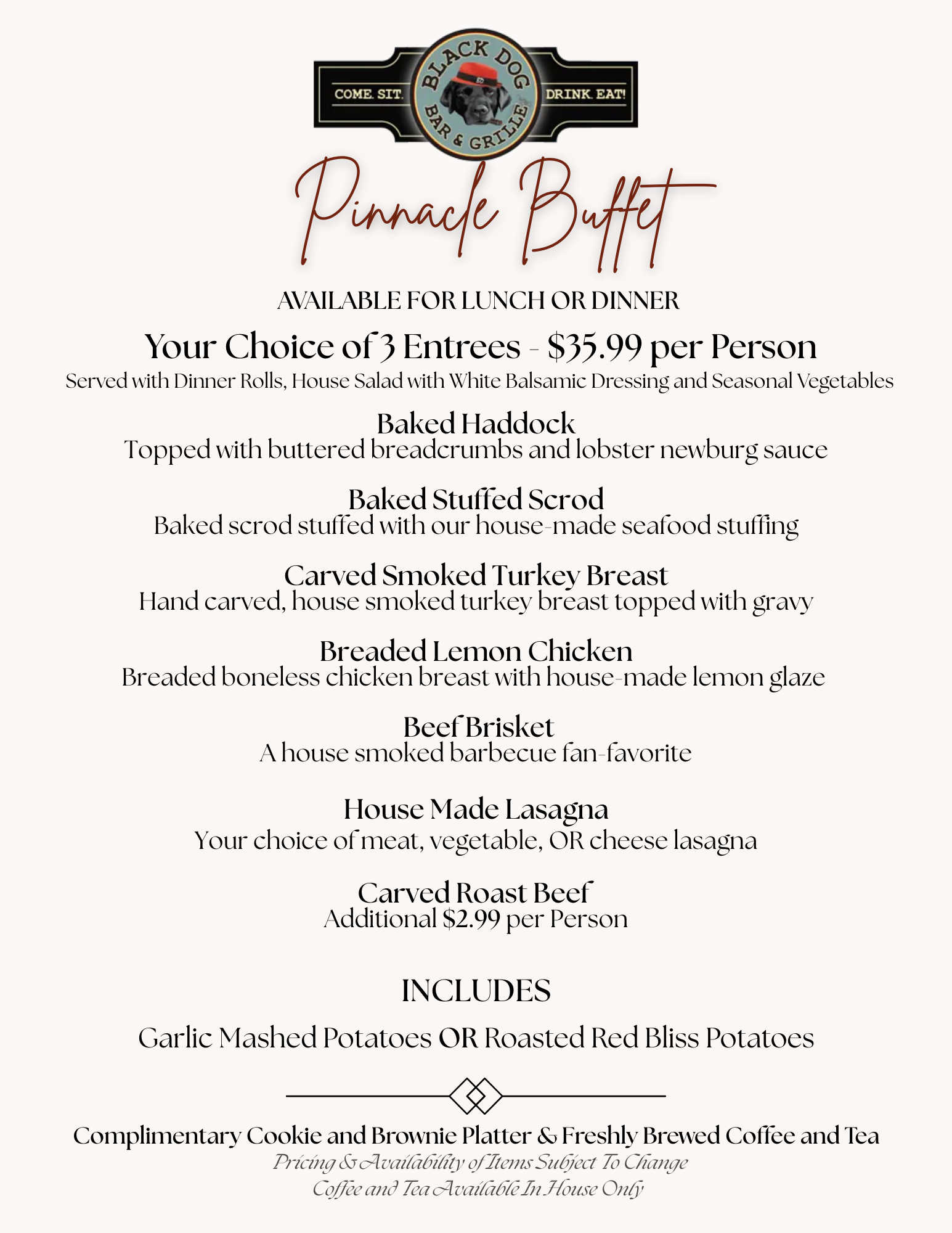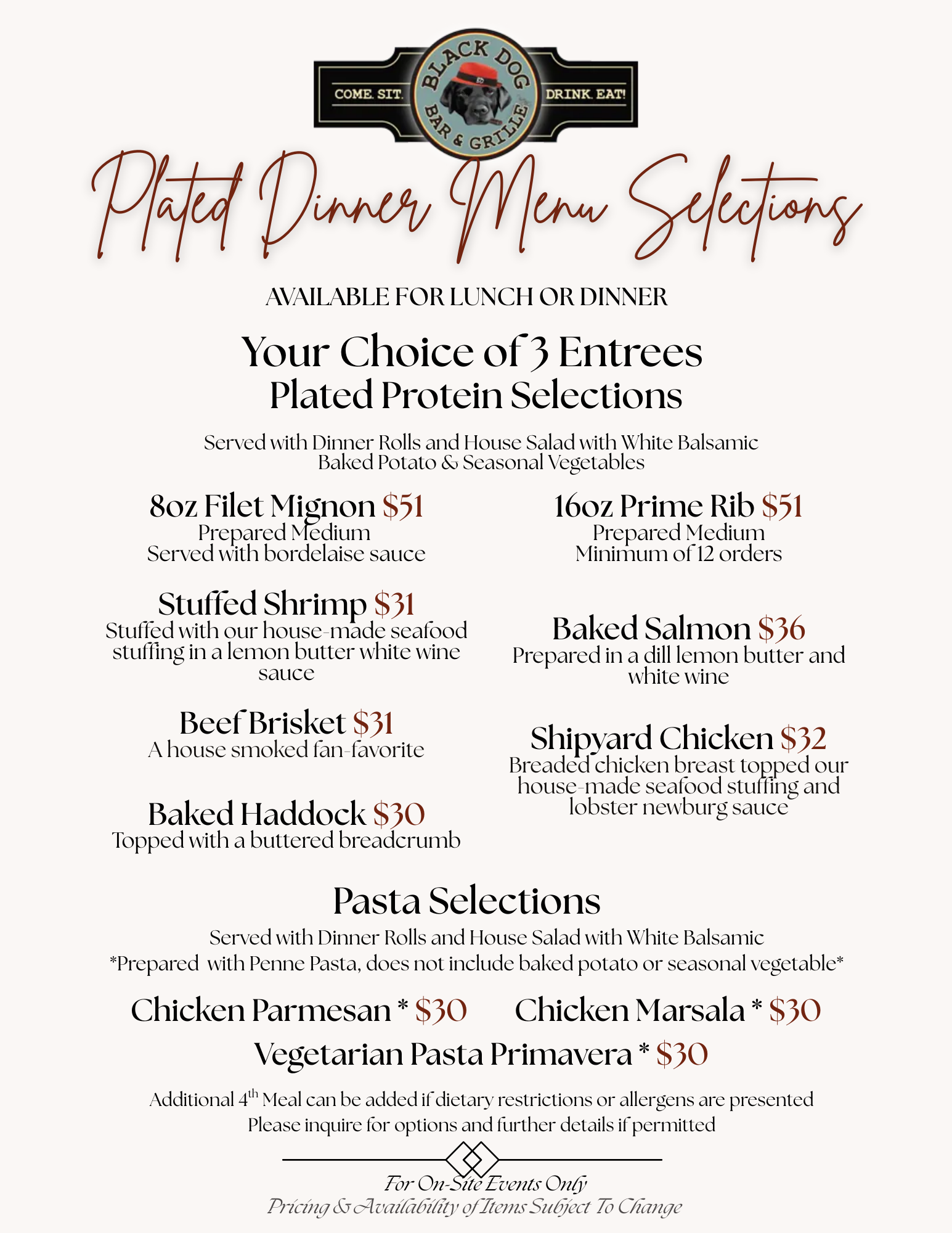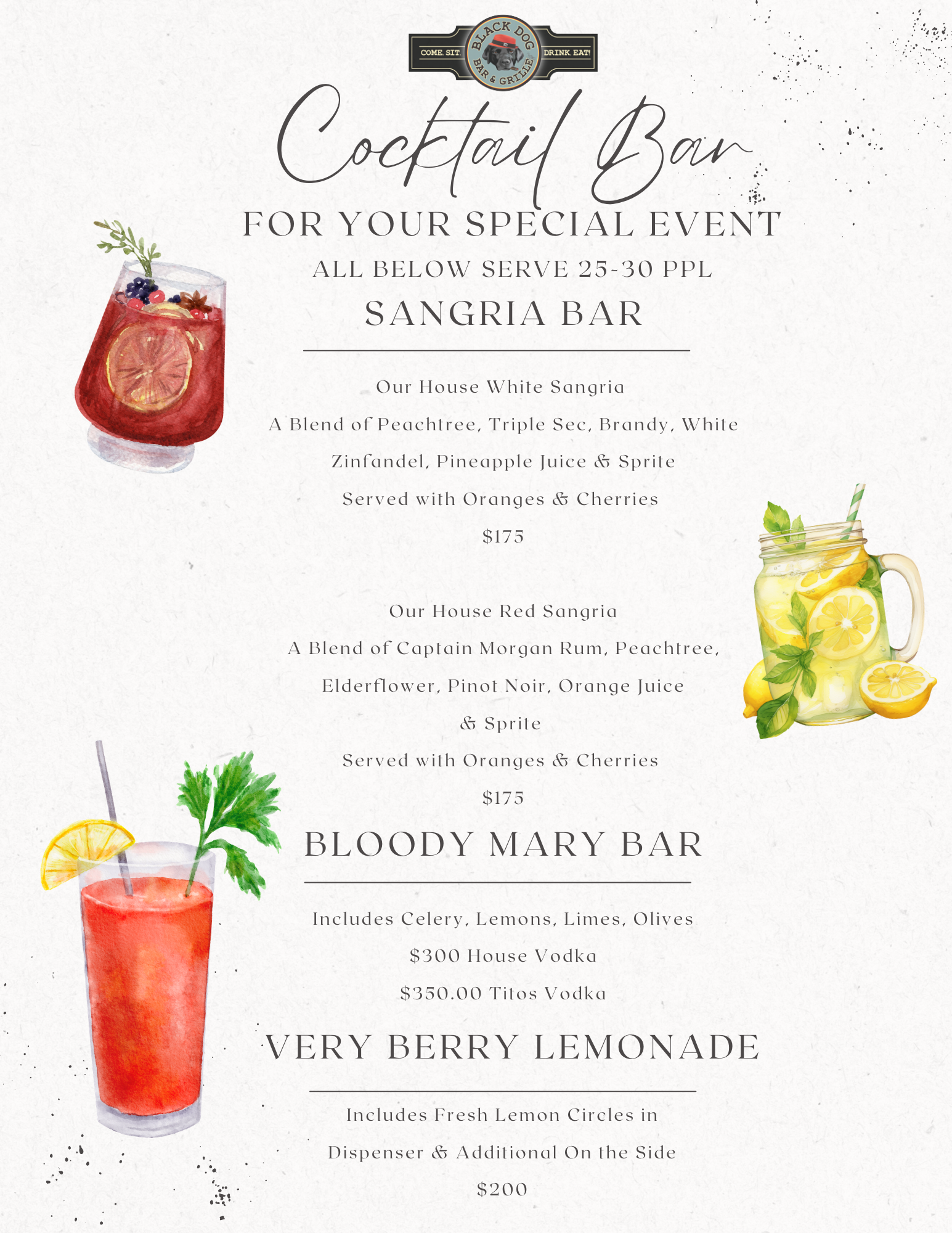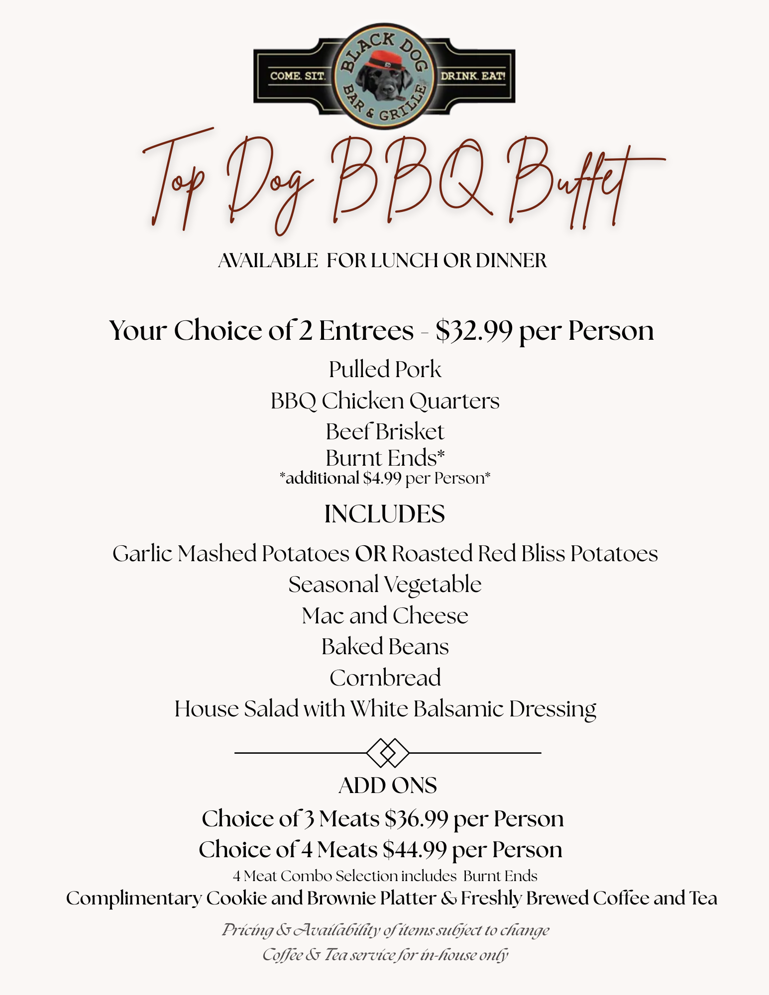 We look forward to helping you create a memorable event here at the Black Dog Bar & Grille! If you have any questions or would like to confirm your booking inquiry, please reply to this email or text 959-444-3167 with your preferred call-back time to discuss further details!