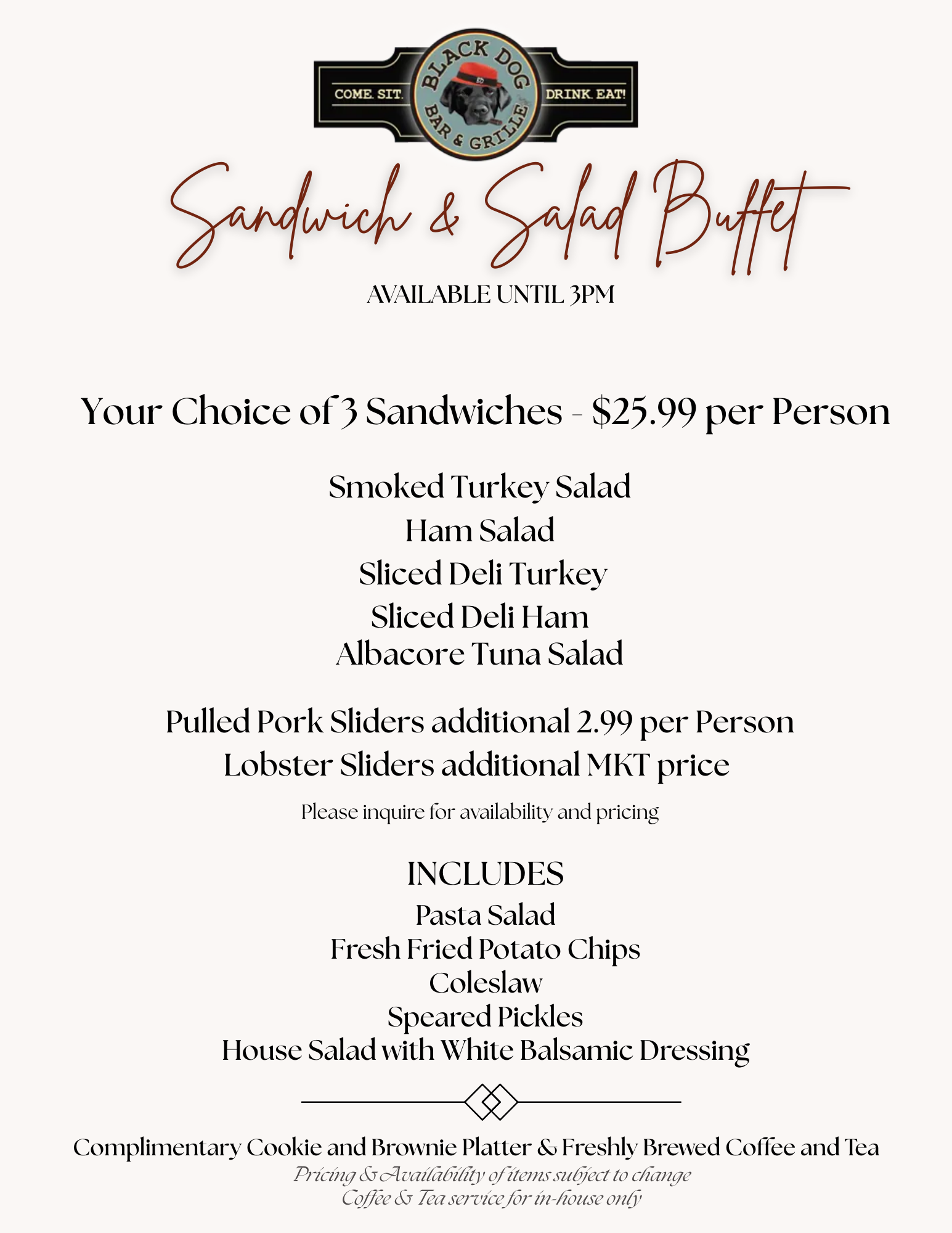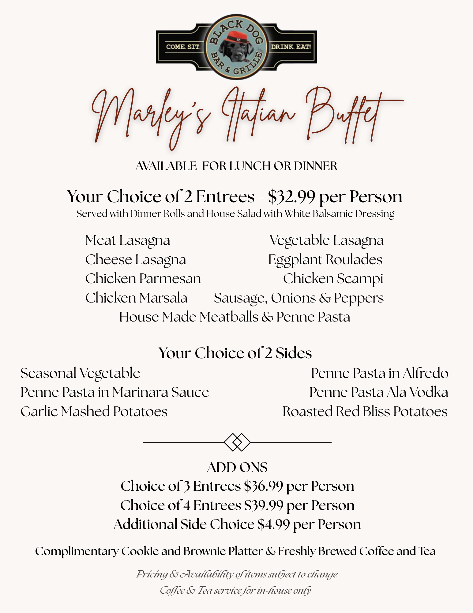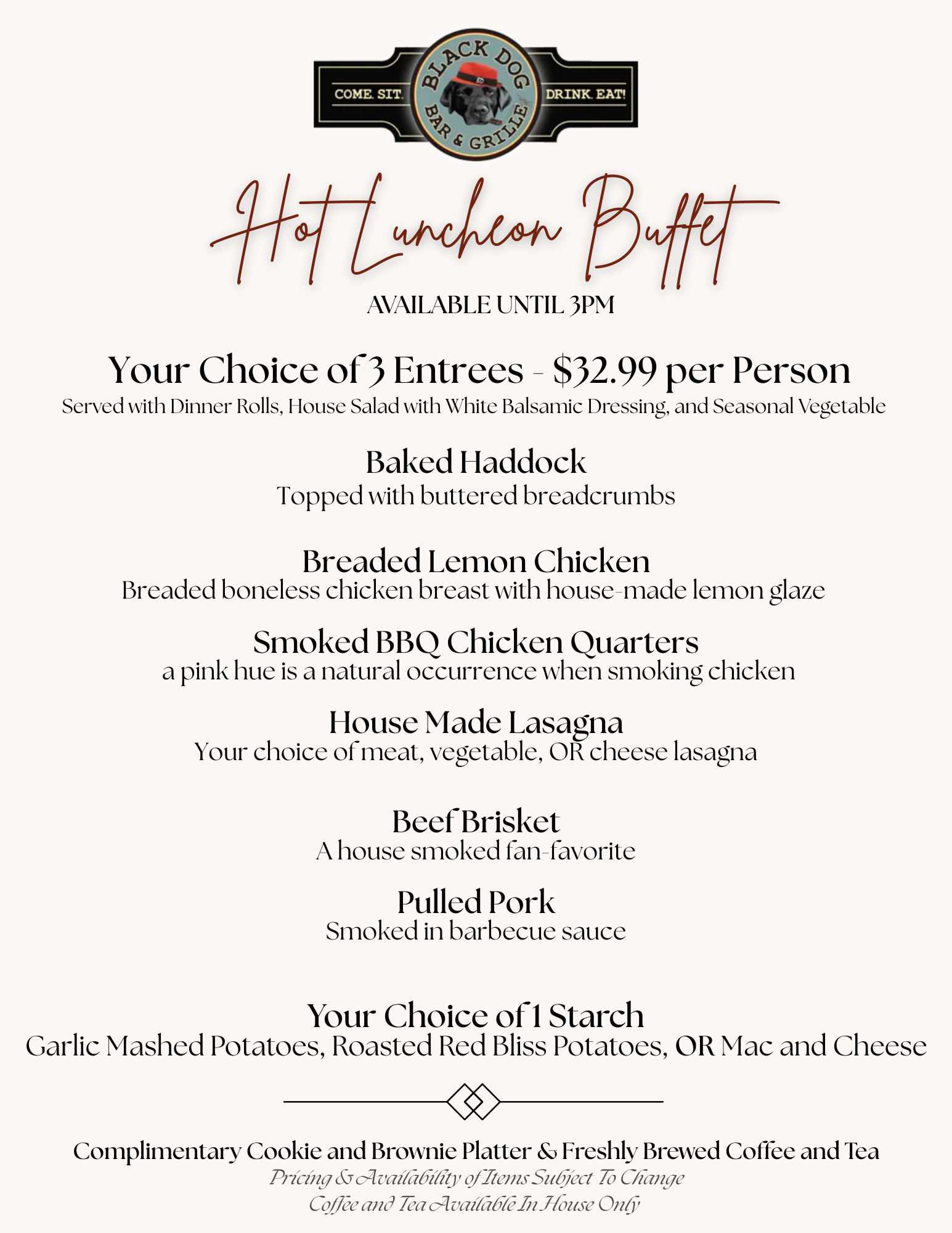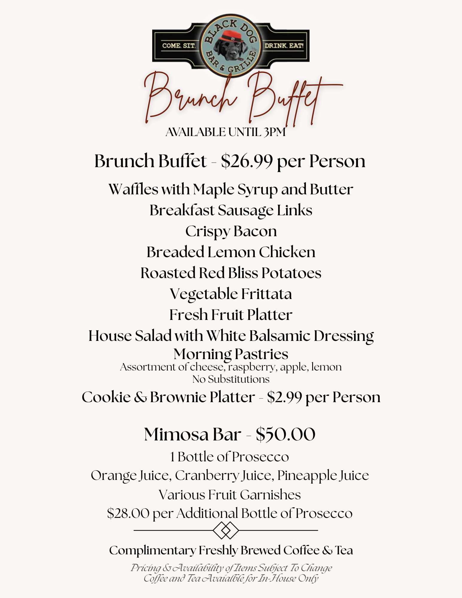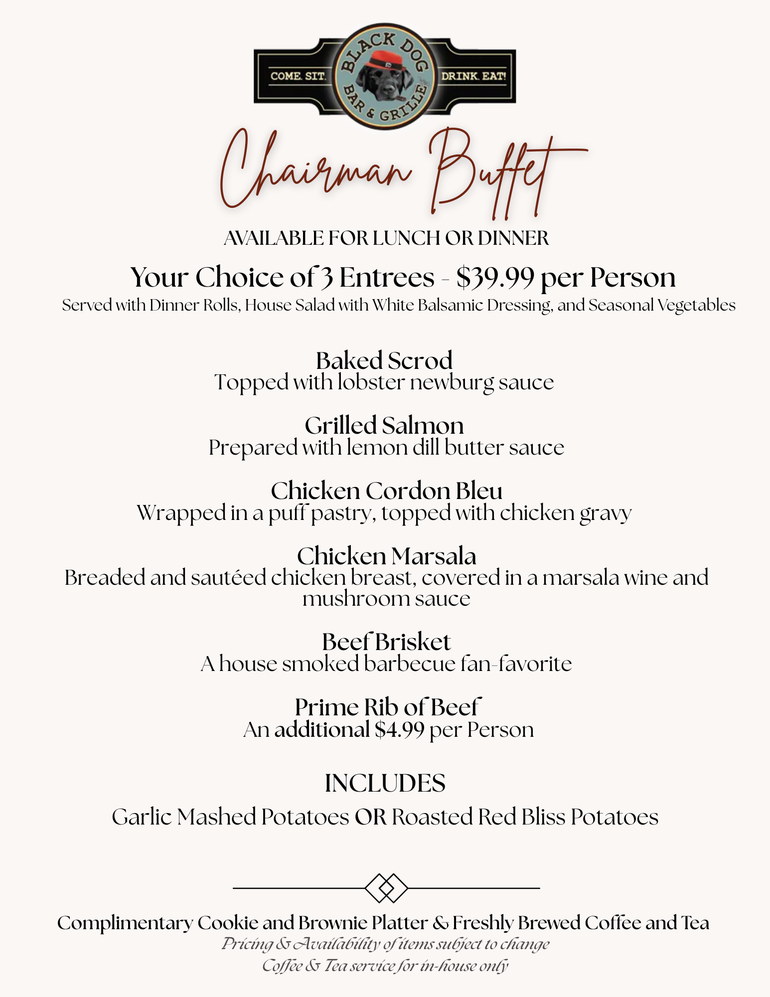We look forward to helping you create a memorable event here at the Black Dog Bar & Grille! If you have any questions or would like to confirm your booking inquiry, please reply to this email or text 959-444-3167 with your preferred call-back time to discuss further details!