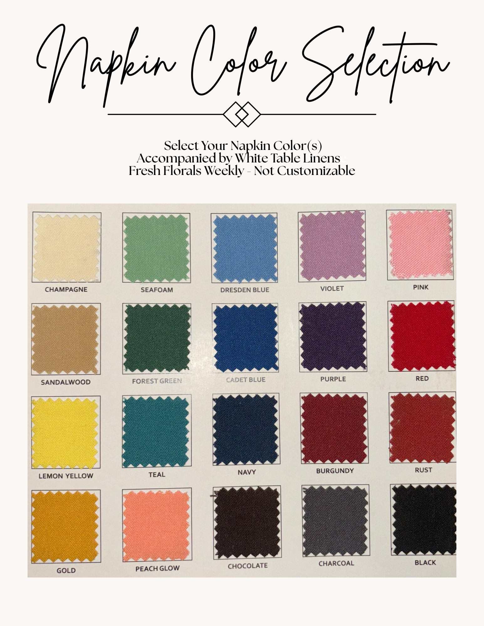 $199 Friday through Sunday. This fee includes white table linens, napkins in the color of your choosing. and fresh floral centerpieces.